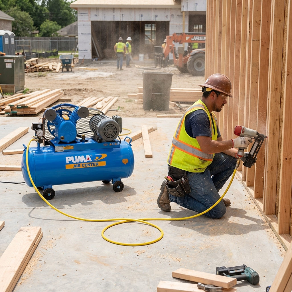 The Puma PK30-120A is an electric air compressor characterized by a single-phase, single-stage design. It features a 3-horsepower electric motor and a tank capacity of 110 liters. The working pressure capability extends up to 8 Bar, and it delivers a free air delivery of 13 CFM.